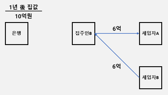 1년 후, 집값은 아직 그대로 입니다. 하나 변한게 있다면 기존 세입자 A가 방을 뺄테니 전세금을 돌려다라는 요청이 왔습니다. 가진 현금이 없는 집주인 B는 세입자 B를 급하게 구해서 전세금 6억을 마련하고 그 돈을 세입자 A에게 돌려줍니다.