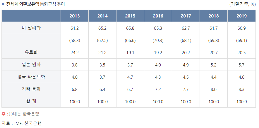 한국은행도 이와 유사한 원칙에 입각하여 통화구성을 결정하고 있으며 미 달러화 외에 유로화, 일본 엔화, 영국 파운드화, 호주 달러화 및 캐나다 달러화 등 주요 6개 통화를 중심으로 분산 투자하고 있다. 또한, 2012년에는 중국의 국제적 위상 제고와 우리나라와의 경제적 연계성 증대 등을 고려하여 중국 위안화에 대한 투자를 시작하였다. 2019년말 현재 보유외환중 미 달러화 비중은 69.1%를 차지하고 있다. 이는 전세계 공적 보유외환에서 미 달러화가 차지하는 비중 60.9%를 상회하는 수준이다.