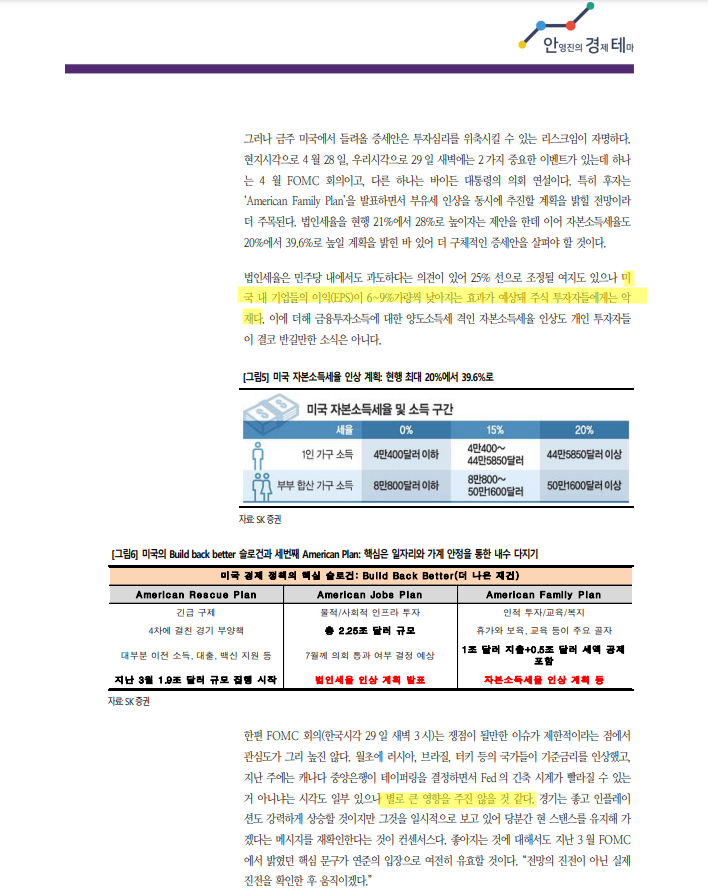 210426_안영진의 경제테마: 기업 실적 긍정적, 수급 부정적(신흥국 금리상승, 캐나다 테이퍼링 시작), 외부환경 중립(E: 금리 안정, P: 미국 법인세, 개인 소득세 인상 이슈 -> 기업의 C증가로 인한 ..