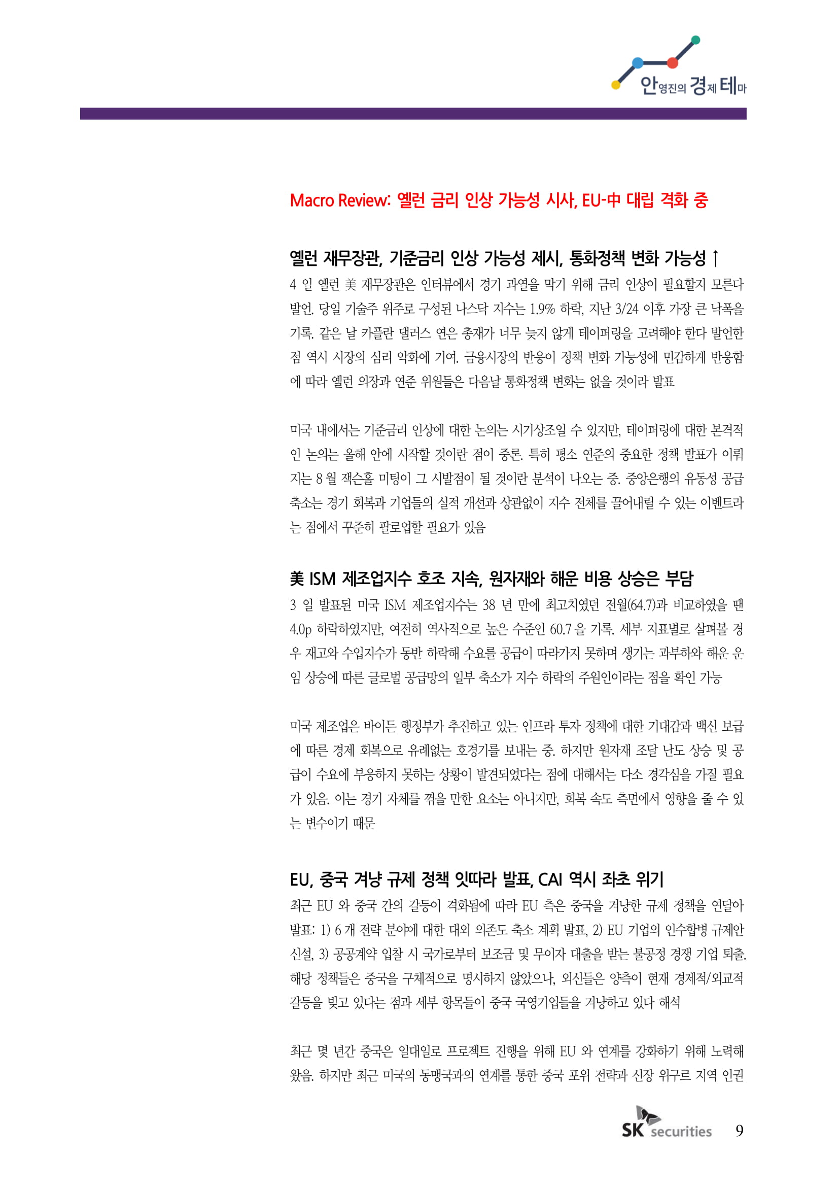 210511_안영진 경제테마: 공급 쇼티지의 2가지 결과(1. 공급 가격 상승으로 인한 기업의 매출원가C 상승, 2. 소비자 가격전가에 의한 Q하락), 인플레이션 가능성 상승, 옐런의 금리 상승 발언, EU-중..