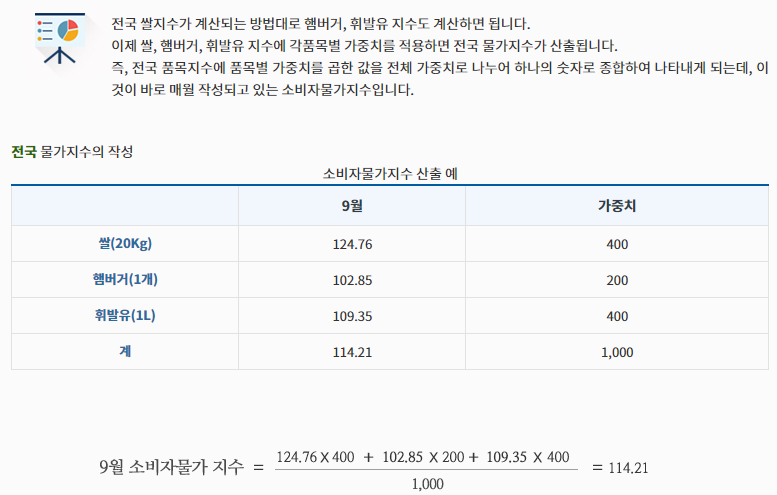 예를 들어, 쌀에 대한 가구지출비중이 달걀보다 3배 더 많다면 쌀 가격과 달걀 가격이 동일하게 10% 상승하더라도 쌀 가격상승이 물가에 미치는 영향력은 달걀 가격 상승 보다 3배 많을 것입니다.
