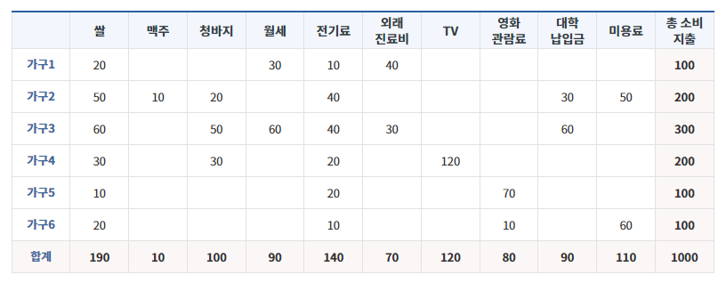 아래는 이 나라 여섯 가구의 1년 동안의 소비지출을 기록한 가계부입니다.