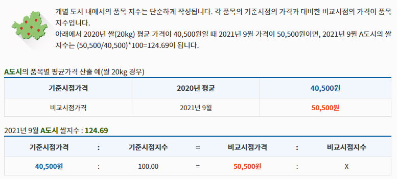 다만, 농축수산물, 석유류는 월중에도 가격변동이 심하기 때문에 매월 3회 조사하여 평균 가격을 사용합니다.