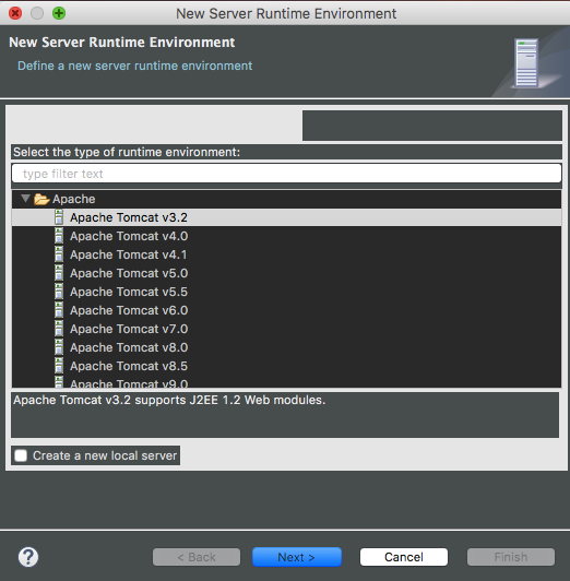 그럼 아래와 같은 창이 또 뜨는데, 저기에서 내 컴퓨터에 있는 톰캣 버전과 일치하는 항목을 선택한 후, Next 버튼을 클릭!