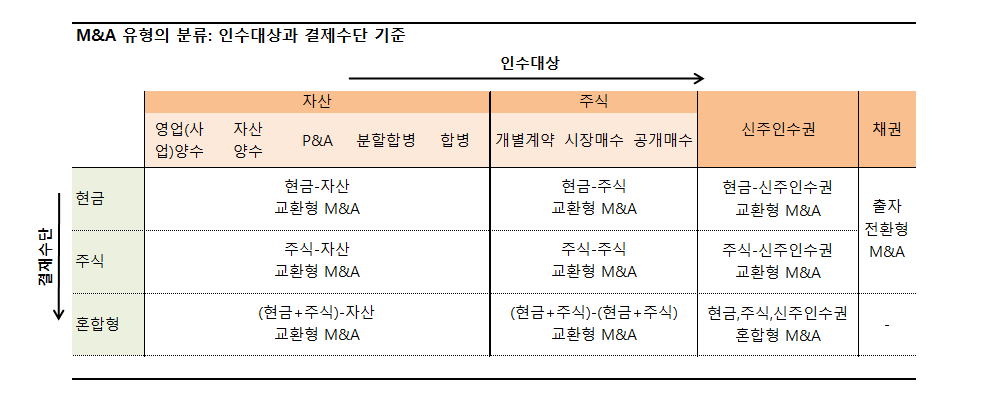 M&A의 유형별 분류, M&A의 스킴 종류(인수대상, 결재수단에 따라), 스킴별 장단점