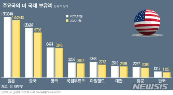일본은 환율 개입을 위한 자금력을 미국채 매도를 통해 확보하고 있다. 위 그림에서 보듯 '22년 일본의 미국채보유량은 세계 1등으로, 일본은 외화자산의 대부분을 미국채를 통해 마련하고 있다. 일본 뿐만 아니라 대부분의 선진국이 자국 화폐 가치 방어를 위해 미국채 매도를 개시하고 있으며, 이는 FOMC 금리 인상에 제동을 주고 있다.