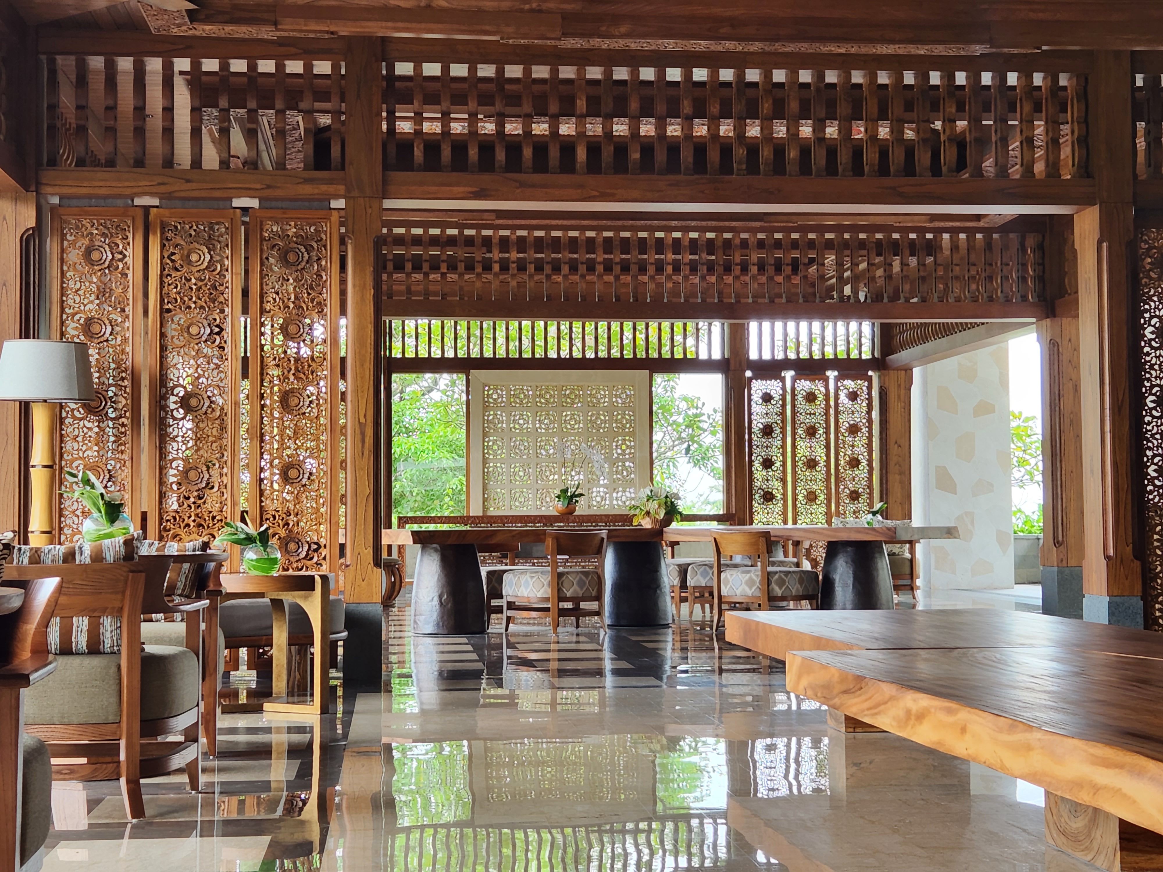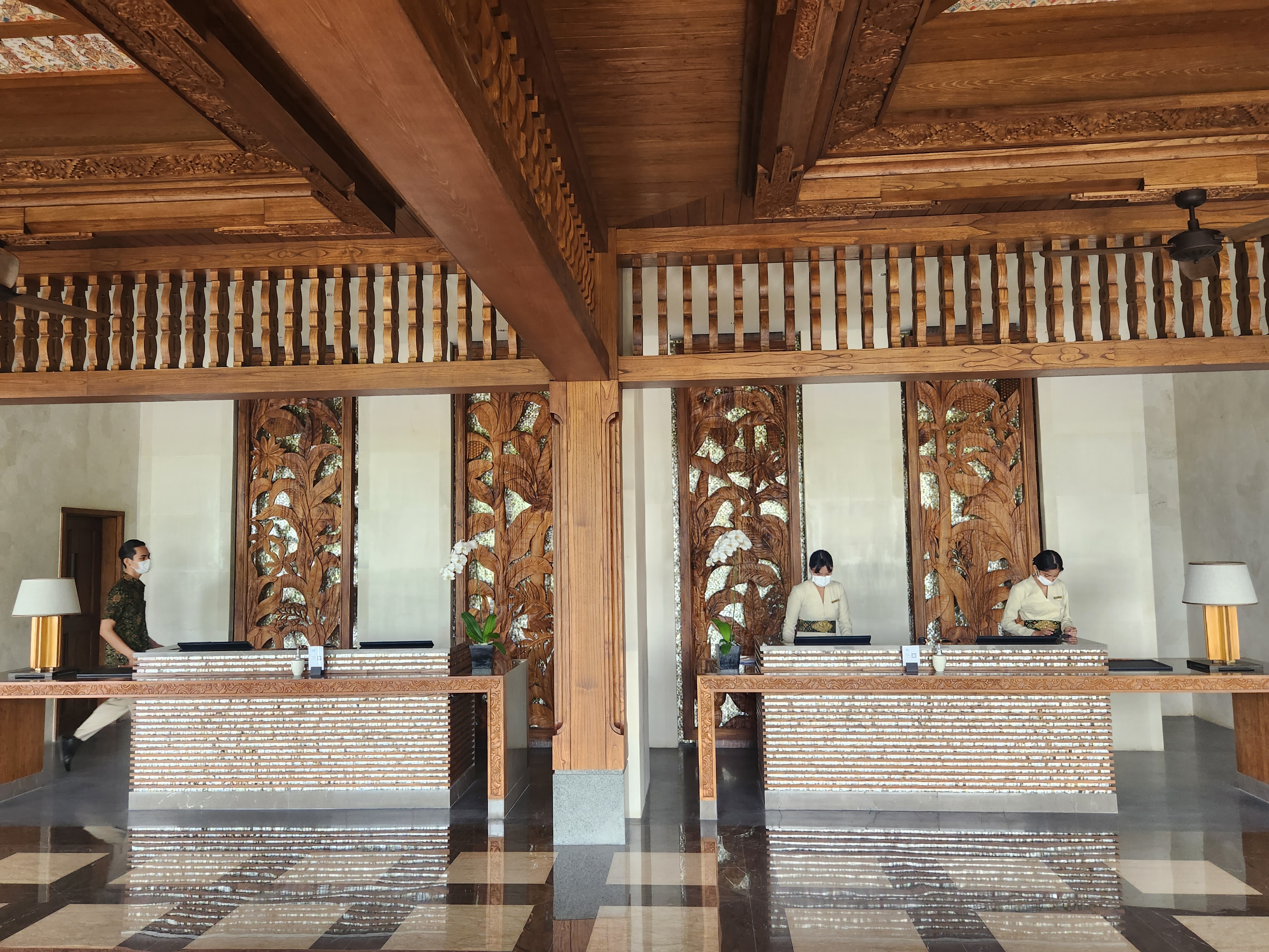 처음 입장했을 때 묵직한 느낌이 나는 나무위에 꽃을 새겨넣은 장식물들이 로비를 비롯 객실에도 배치되어 있습니다. 발리에서 많이나는 Teak 나무를 활용해 발리 전통 문양을 새긴거라고 하는데 독특하더군요.