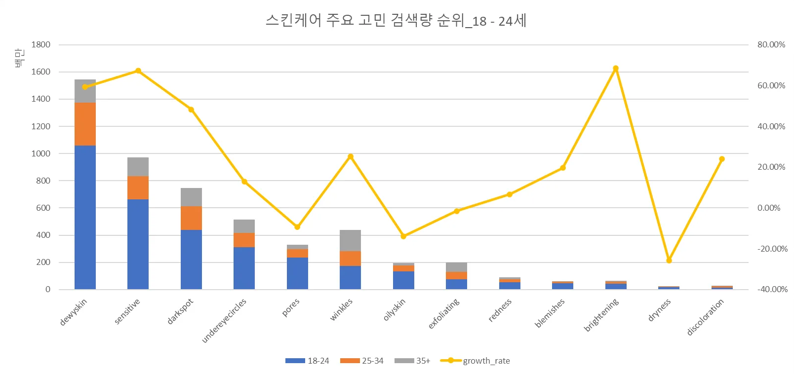 - (18 ~ 24세) 물광 → 민감성 → 다크스팟 → 다크서클 → 모공 → 주름 → 지성피부 順