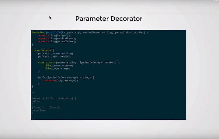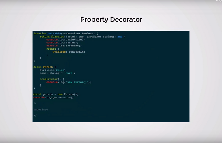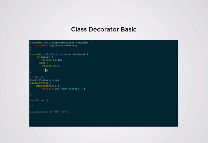 ※decorator는 선언과 동시에 콜되기 때문에, const person = new Person();초기화되지 않아도 class Person{...}만으로 실행된다.