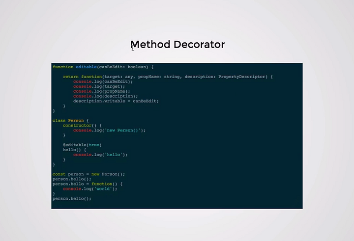 1 2 3 4 5 6 7 8 9 10 11 12 13 14 15 16 17 18 19 20 21 22 23 24 25 26 27 28 29 30 31 32 33 34 35 36 | function editable(isEdit:boolean){ return function(target:any, propName:string,description:PropertyDescriptor){ console.log(target); console.log('propName:'+propName); console.log(description); target.heyjude = 'heyjude'; } } class Person{ constructor(){ console.log('new Person():'); } @editable(true) hello(){ console.log('hello'); } } const person = new Person(); person.hello(); console.log(person.heyjude); // Person {} // propName:hello // { value: [Function: hello], // writable: true, // enumerable: false, // configurable: true } // new Person(): // heyjude | cs |