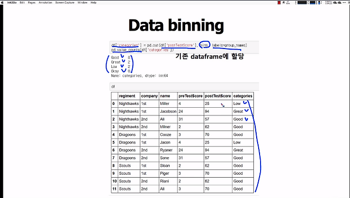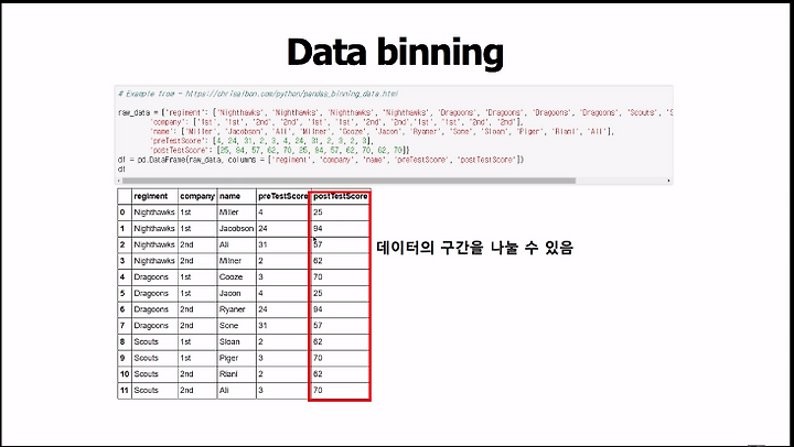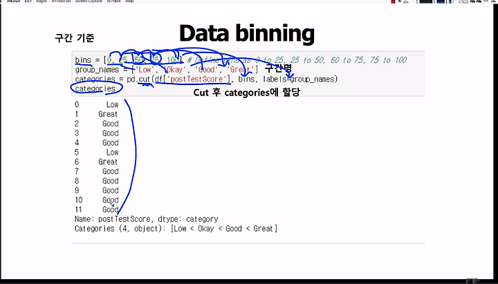 6-7. categorial data handling(one hot encoding, get_dummies, data binning, pd.cut,
