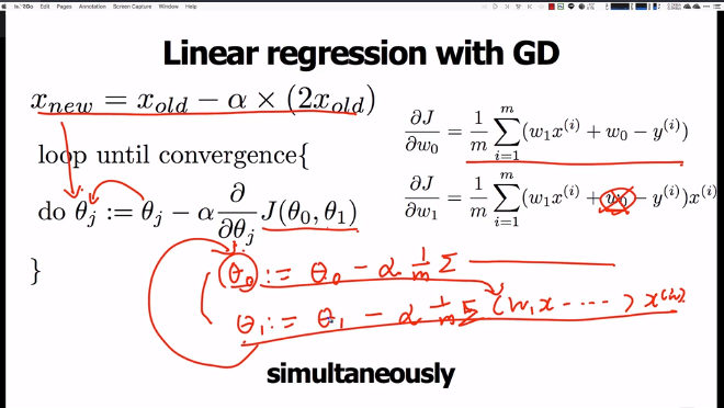 ・w0값 갱신 -> w1값 갱신 -> 갱신된 값을 동시에 w0식과 w1식에 넣음 -> ...(O)