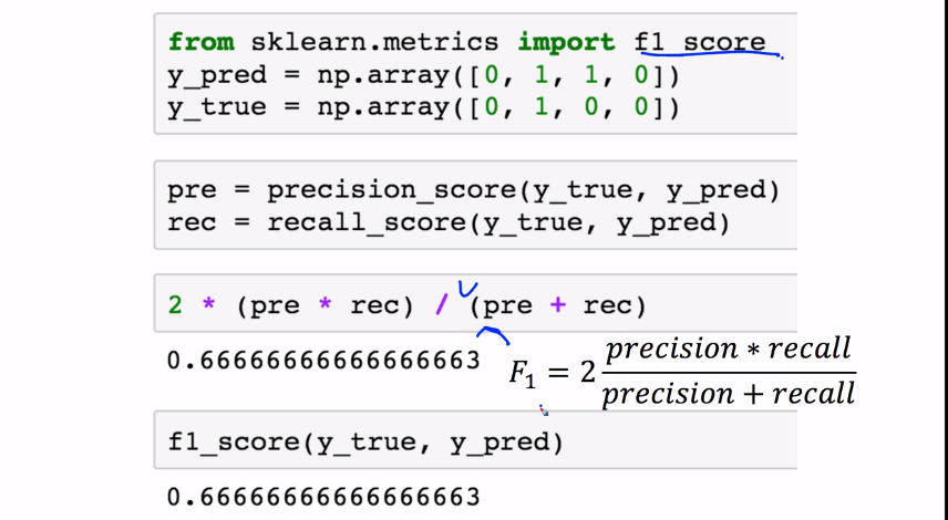 - 정밀도 : 전체를 긍정이라고 예측한 비율이라고 한정할 때, 그중 실제값도 긍정인 비율 = 2/5