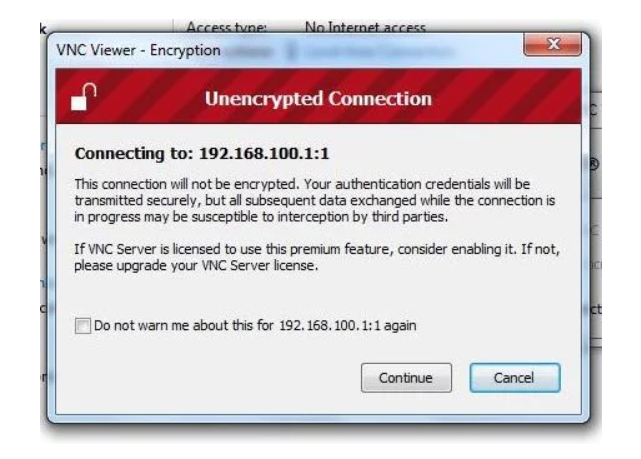 Enter the IP address of your Raspberry Pi given dynamically by your laptop (you got the address from the earlier step) and append with :1 (denoting port number) and press connect. You will get a warning message, press ‘Continue’: