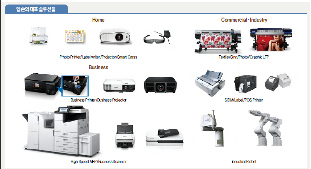 결국 마이크로 피에조 기술 개발에 성공한 것도 이 기술을 고객이 원하는 수준으로 만들어내고자 하는 노력 때문이었다. 이처럼 엡손은 오랫동안 고객 관점에서 핵심 기술을 갈고 닦으면서 축적해 나가고 있다. 마이크로 피에조 기술을 기반으로 여러 분야의 고객을 만족시키고 있는 것처럼 프로젝터 사업에서는 3LCD 기술을 기반으로 고객가치를 증대시키기 위한 혁신을 지속하고 있다. 로봇 솔루션 사업은 재미있게도 엡손의 시계 조립생산을 자동화하기 위해서 1983년 처음 만들어졌다. 한 번 기술을 개발하면 고객이 원하는 방향으로 기술을 지속 발전시키는 엡손의 특징은 산업용 로봇 분야에서도 그대로 나타났다. 수정 압전((壓電) 방식을 적용한 독자적인 포스 센서 기술을 원천 개발한 이래, 스카라 로봇은 2017년 세계 시장점유율 30%로 경쟁사들과 큰 격차를 유지하고 있다. 이는 고객의 니즈와 환경에 최적화할 수 있는 다양한 라인업을 보유하고 있기 때문이다. 또 소형수직다관절(6축) 로봇은 에너지와 공간 절약을 위해 소형화와 경량 설계를 추구하며 세계 최초의 슬림 폴딩 암 구조를 개발해 차별화된 고객가치를 제공하고 있다.