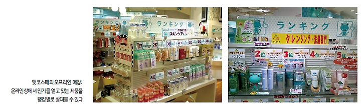 화해의 청사진은 아마존이 2015년 말부터 오픈하기 시작한 오프라인 서점 ‘아마존북스’를 연상시킨다. 미국 시애틀, 포틀랜드 등에 오픈돼 있는 아마존북스는 일반적인 오프라인 서점과는 다르게 온라인과 오프라인이 결합돼 있다. 주요 코너에 아마존닷컴에서 별 5개 만점 중 4개 이상을 받은 책들이 전시되며 별 4.8개 이상의 높은 평가를 받은 책들을 가장 눈에 띄는 입구에 배열된다. 구체적으로는 일본의 ‘앳코스메’가 화해 오프라인 매장의 롤모델이라고 할 수 있다. ‘앳코스메’는 리뷰를 등록해 평점을 기록할 수 있게 한 화장품 포털. 일본 여성 1000만 명 이상이 사용할 만큼 대중적인 서비스인 앳코스메는 오프라인 매장 사업도 벌이고 있어 화장품 유통시장에서 목소리가 막강하다. 아마존 북스토어와 마찬가지로 앳코스메 역시 온라인에서 경험하던 것을 오프라인에 그대로 옮겨놓았다는 것이 가장 강력한 특징이다. 기존 드럭스토어들이 브랜드 위주로 제품을 진열해놓았다면 ‘각질 고민이 있는 사람들이 매긴 베스트 스킨 1∼5위’ ‘피부톤에 고민이 있는 사람들이 매긴 1∼5위’ 등 온라인상의 랭킹 정보를 가져와 소비자들이 더 쉽게 물건을 고르게 하는 식이다. 바로 옆에는 피부에 직접 발라볼 수 있는 ‘트라이얼 존’이 마련돼 있으며 각종 소비자 리뷰가 모니터를 통해 흘러나온다.