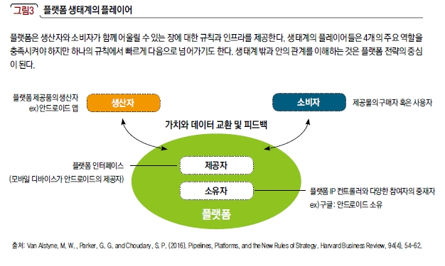 비즈니스 모델 측면에서 살펴보면 플랫폼의 개념이 단순한 하드웨어에서 소프트웨어, 서비스(예: Facebook, Airbnb, Netflix 등)로 확대되면서 시장에서 플랫폼의 ‘중개자(Aggregator)’로서의 전략적 역할이 강조되고 있으며 네트워크 효과 등을 통해 새로운 사업의 생태계가 구축되고 있다.