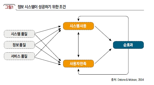 화해는 이러한 난관들을 극복하고 어떻게 데이터 기반 비즈니스가 성공하고 생존할 수 있는지를 보여준다. DeLone & McLean(1992)의 IS Success 모형6 을 분석의 틀로 활용해 성공요인을 살펴보려 한다. 사용자의 사용 의도와 만족에 영향을 미치는 요인인 시스템 품질, 정보 품질 및 서비스 품질을 분석함으로써 전자상거래, 웹 및 앱과 같은 정보 시스템의 성공 경로를 파악할 수 있는데 화해의 사례를 이에 비춰 살펴보면 다음과 같이 정리할 수 있다.