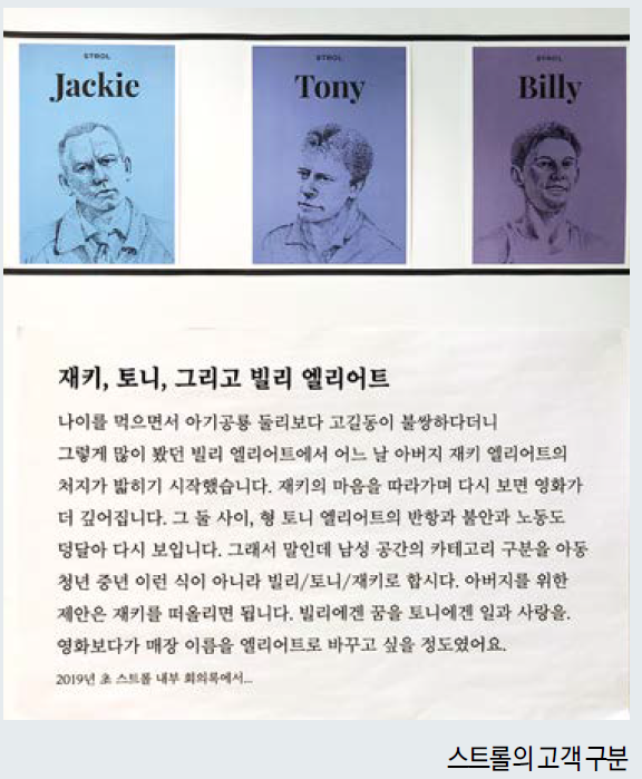 상품을 맥락 있게 제안하는 것은 어떤 의미일까? 오디오 매장에 음반을 놓는 것은 맥락이 아니다. 만일 우리가 남성 고객에게 ‘클래식을 들으라’고 제안하고 싶다면, 그에 필요한 기기와 콘텐츠를 놓는 것이 맥락이다. 남성 고객에게 요리를 권하고 싶으면 앞치마를 소싱한다. 제안의 대상도 맥락에 포함돼 있다. 예컨대, 야구글러브를 스포츠용품 코너가 아니라 아이용품 코너에 놓았다는 것은 ‘게임보다는 밖에 나가 놀게 하라’는 제안을 담은 행위다. 맥락은 스트롤이 고객을 구분하는 방식에도 반영돼 있다. 스트롤은 고객을 아동, 청년, 중년 이런 숫자로 대표되는 연령이 아니라 영화 ‘빌리 엘리어트(Billy Elliot)’에 나오는 재키, 토니, 빌리 엘리어트의 캐릭터에 착안해 분류했다. 아버지를 위한 제안을 할 때는 재키, 청년을 위한 제안을 할 때는 일과 사랑을 중시하는 토니, 아동을 위한 제안을 할 때는 꿈 많은 빌리를 떠올리자고 제안했다.