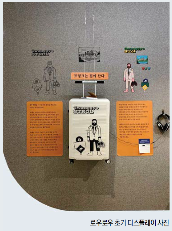 이미 히트 상품인 로우로우(RAWROW) 트렁크를 입점시키면서도 “이걸 구태여 왜 여기까지 와서 사야 하지?”란 질문을 던졌다. 그래서 다른 어느 판매점에서도 하지 않는 형태로 래핑을 했다. 래핑 디자인은 디자인 스튜디오 슈퍼픽션(SUPERFICTION)과 ‘광교’의 로컬 정체성을 모티브로 협업, 제작했다. 트렁크 래핑은 단순한 데코레이션이 아니라 ‘트렁크는 집에 산다’는 해석을 담은 결정이다. 사람들은 트렁크를 여행 갈 때 쓰는 것으로 생각하지만 내 생각엔 트렁크가 가장 오래 있는 곳은 ‘집’이고 사람들은 그 큰 트렁크를 어디다 둘지 곤란해 하곤 한다. 그러니 원하는 디자인으로 꾸며 평소에도 잘 보이게 놓으라는 새로운 제안이었다.