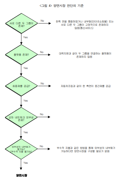양면시장(플랫폼)의 정의, 플랫폼의 존재여부, 외부성의 존재여부, 외부성의 내부화의 불가능 여부에 따라