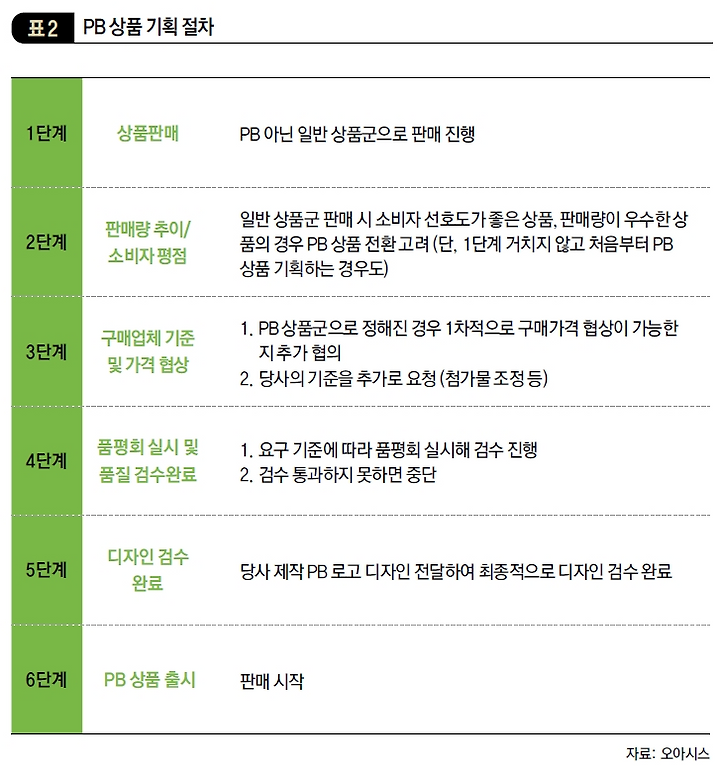 이런 기준은 오아시스마켓 전용 PB 상품을 만들 때도 그대로 적용된다. PB 상품을 기획할 때는 오아시스 브랜드 로고가 새겨지는 만큼 아예 처음부터 맞춤형 스펙을 갖출 것을 요구한다. PB 상품에 대해서는 한층 더 깐깐한 잣대를 들이대는 것이다. (표 2) 한 예로, 오아시스의 ‘우리밀 비빔냉면’을 기획할 때는 MSG 등 첨가물을 빼기 위해 제품을 수정하고, 테스트하고, 돌려보내는 데 장장 6개월이 걸렸다. 상품기획 절차가 까다롭다 보니 때때론 조미료 없이 맛을 살릴 수 없다며 오아시스마켓 납품을 포기하는 업체들도 있다. 첨가물을 빼면서도 기존의 맛을 자연적으로 유지하는 게 그만큼 어려운 작업이라는 의미다. 이렇게 PB 상품 하나가 탄생하려면 김영준 의장, 최우식 대표 등 최고경영진이 총출동한 품질심의위원회를 거쳐야 한다. B2C 사업은 품질이 생명이기 때문에 경영진이 하나부터 열까지 체크한다.