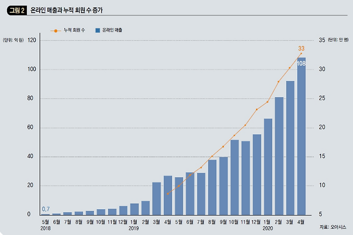 이렇게 거대 자본을 등에 업고 공격적으로 팽창 중인 업체들과 비교하면 오아시스는 ‘흙수저’ 신세나 다름이 없다. 올해 초 한국투자파트너스로부터 126억 원을 유치하기 전까지는 2013년 창업 이후 줄곧 무차입 경영을 고수해 왔고, 수차례 대형 투자 제의를 고사하면서 빚 없이 독자 생존의 길을 걸었다. 그러던 오아시스가 쟁쟁한 경쟁사들 사이에서 존재감을 드러내고 경계 대상으로 떠오른 것은 바로 지난해 실적이 발표되면서다. 2019년 매출액 1424억, 영업이익 10억 원으로 적자 일변도의 레드오션에서 유일하게 흑자를 거둔 것이다. 새벽 배송이 ‘지속가능한 사업’이 될 수 있다는 걸 시장에 증명한 셈이다. 2018년 8월, 새벽 배송에 뛰어든 지 2년 만에 온라인 누적 회원 수가 올해 4월 기준 33만 명을 넘어섰고, 온라인 월 매출은 100억 원을 돌파하는 등 가파르게 성장하고 있다. 광고 한번 없이 오직 입소문만으로 거둔 성과다. “외형 성장보다 내실을 다지면서 가려 한다. 올해 첫 투자 유치도 자금이 필요해서가 아니라 성장성에 대한 의구심을 해소하고 주주와 고객에 믿음을 심어주기 위한 것이었다.” 안준형 오아시스 재무기획 이사의 말이다. (DBR minibox I ‘오아시스 회사 소개’ 참고.)