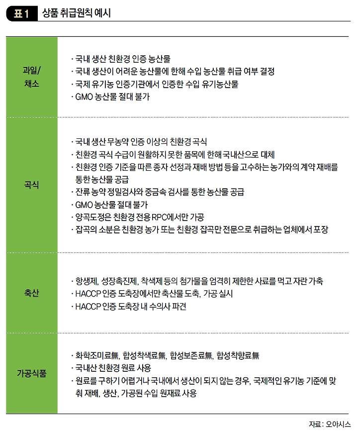 온라인이든, 오프라인이든 식료품 비즈니스의 핵심은 최고의 ‘상품성’이다. 상품성 유지를 위해 빼곡하게 채워진 오아시스마켓의 상품 취급원칙(SPEC)표는 식품에 관한 회사의 철학을 반영하는 동시에 이 플랫폼에 입점하기가 얼마나 어려운지를 짐작하게 한다. 생협 기준에 맞추다 보니 진입 문턱이 높을 수밖에 없다. (표 1) 표에는 과일/채소, 곡식, 수산, 축산, 가공식품, 생활용품 등 카테고리별로 취급 원칙이 상세하게 적혀 있다. 예를 들어, 축산물은 닭, 돼지, 소 등 종류 불문 항생제 검사를 통과한 ‘무항생제’ 제품이어야 하고, 채소와 곡식, 수산물은 ‘무농약 인증’ 이상이어야 한다. 단, 일부 과일에 대해서만 예외적으로 무농약이 아닌 저농약 인증을 요구한다. 유기농 사과, 배처럼 1개당 가격이 1만 원이 넘어 저농약 제품으로 대체할 수밖에 없는 품목이 이런 예외다.