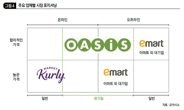 김 의장은 대형 유통 채널의 틈바구니에서 생협 매장이 충성고객층을 공고히 했듯 온라인에도 틈새시장이 있을 것이라고 확신했고, 2018년 오아시스마켓을 출범했다. 비영리법인이라는 한계, 조합원만을 상대하는 폐쇄성을 벗고 ‘고품질 신선 식품을 최저가로 판다’는 생협의 포지셔닝을 그대로 유지한다면 충분히 경쟁력이 있다고 봤다. 특히 대형 유통 채널의 경우 일반 식품 수요가 잠식당하지 않으려면 유기농 식품을 프리미엄 가격에 판매할 수밖에 없다는 약점도 간파했다. 유기농 식품을 이들 채널의 일반 식품과 비슷하게, 혹은 더 싸게 취급한다면 확실한 가격 우위가 있다는 계산이었다. (그림 4)