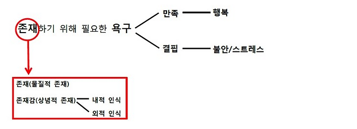 행복의 정의에 의하면 행복은 자기만족이다. (타인의 행복을 존중한 상태에서) 자기만족을 느낄 수 있는 모든 정신 상태를 포괄적으로 행복이라고 말할 수 있다. 샤워를 할 때의 만족감, 타인을 도와줌으로써 얻어지는 만족감, 맛있는 음식을 먹었을 때의 만족감, 자신을 멋지게 치장했을 때의 만족감, 오락을 즐길 때의 만족감, 대자연을 느낄 때의 만족감, 지적 성취를 이루었을 때의 만족감 등 만족감의 원인이 되는 상위개념을 생각하면 그 가짓수가 셀 수 있을 정도로 압축되겠지만, 개개인은 모두 다른 개성을 지니기 때문에 피상적으로 우리가 행복을 느낄 수 있는 가짓수는 사람의 수만큼 많다고 보면 된다.(Q : 행복은 자기만족. 그렇다면 자기만족은 무엇인가? 자신의 존재가 인식될 때 자기만족을 이룰 수 있나?) 행복은 욕구의 만족과 직접적으로 연관된다. 아래의 메커니즘과 같이 욕구가 만족될 시에 행복하며, 결핍될 때 불안/스트레스와 같이 불행하다고 느끼는 감정과 생각이 들어선다. 한층 더 나아가서 욕구란, 인간이 존재하기 위해 반드시 필요한 것이다. 존재 - 욕구 - 행복과 불행 이라는 인과관계를 따라가 봤을 때, 궁극적으로 우리가 행복을 원하는 이유는 '존재'다.(2016.8.31)
