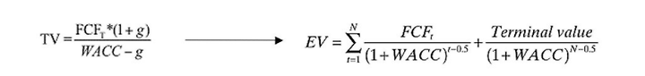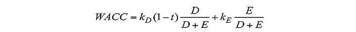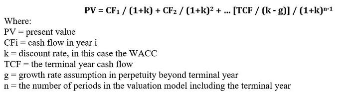 The DCF method estimates the attractive of a business opportunity by analysing future cash flow projections and discounting them using, in this case, the Weighted Average Cost of Capital (WACC) to obtain a present value. The formula used is: