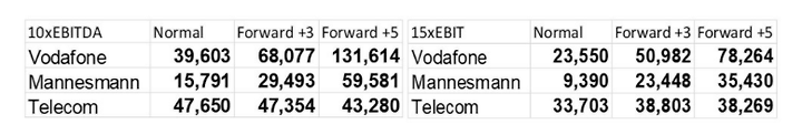 Mannesman: the closest value is EV/EBITDA Forward +3(-13%). Depreciation and amortization might create here some distortion given that Mannesmann group operates in the engineering and automotive business as well, therefore using the EBITDA multiple is more appropriate. Furthermore, the choice of a forward multiple is fine, knowing about the Mannesmann acquisition of Orange and improvement in profits and cash flow in the medium term.