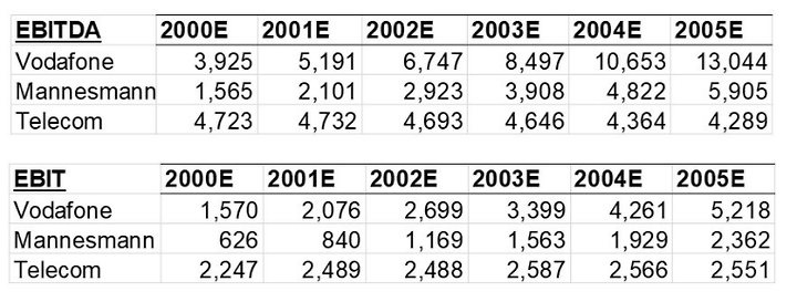 Table 1: Vodafone, Mannesmann and Telecom financials in £mil. GBP/EUR Exchange rate at 31/12/2000 is 1.6.