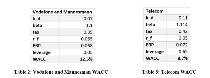 The discount rate used in the DCF method is the WACC, calculated using the formula below and variables in Table 2 (Vodafone and Mannesman) and Table 3(Telecom).