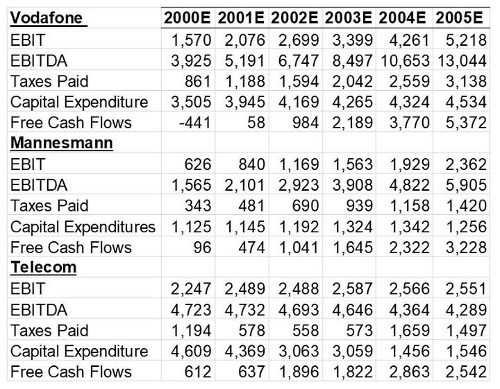For Vodafone and Mannesman, analysts’ projections made in 1999 (in sight of a potential acquisition by Vodafone) together with annual reports and macro economical and market information have been used. For Telecom, annual reports together with macro economical and market information have been used and adjusted where necessary.