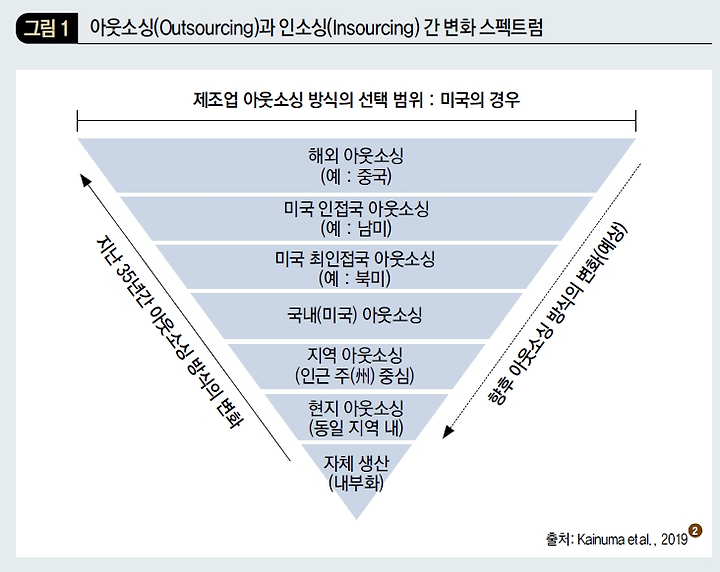 제조관리자 혹은 공급사슬 최고책임자는 제조 거점을 지속적으로 재배치하며 생산의 효율성을 도모해야 한다. 카이누마 교수 등의 2019년 연구1 에 따르면 지난 30년간 주요 2700여 개의 미국 제조 기업의 경우, 회사의 핵심 역량이 아닌 영역이거나 낮은 인건비를 활용할 수 있는 업체를 확보했다면 과감히 외주(Outsourcing)를 주거나 점진적으로 인건비가 낮은 지역으로 이전하는 선택을 해왔다. (그림 1 왼쪽 하단 화살표 참고) 그러나 최근 미국 정부의 리쇼어링 정책이나 지난 수년간 미국 제조업체들의 생산지 재배치 과정을 살펴보면 지금까지와는 정반대 방향으로 향하고 있다. (그림 1의 오른쪽 하단의 화살표 참고)