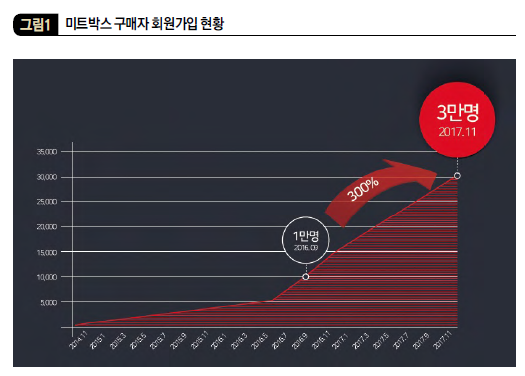 미트박스는 입소문을 타고 빠르게 성장했다. 2014년 4000만 원에 불과했던 거래액은 2015년 89억 원, 2016년 352억 원으로 훌쩍 뛰어올랐다. 2017년엔 전년 대비 2배가 넘는 875억 원의 거래액을 기록했다. 미트박스와 거래하는 음식점도 늘었다. 2016년 9월에 거래했던 식당은 51곳에 불과했다. 2018년 1월 기준 프랜차이즈를 제외한 국내 자영업 식당 20만 곳 가운데 1만7243곳이 미트박스를 통해 고기를 구입한다. 식당과 개인 고객을 포함한 회원 수는 약 3만 명으로, 월평균 10%씩 증가하는 추세다. 2019년이면 손익분기점을 넘을 것으로 기대된다.