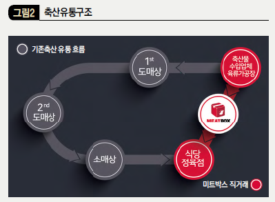 2014년 시작한 온라인 육류 도매 직거래 플랫폼 미트박스 창업자들은 음식점이나 정육점을 운영하는 자영업자들에게 파격적인 제안을 했다. 웹사이트나 스마트폰 애플리케이션으로 고기를 주문하면 30% 정도 저렴한 가격에 공급하겠다는 것이었다. 육류 생산자(수입업체, 도축업자와 같은 1차 육류 가공업자를 지칭함)와 구매자(중소 음식점, 정육점을 운영하는 자영업자)를 직접 연결하면 중간 유통상인들의 마진을 제거할 수 있기 때문이다. 주문 방식은 간단했다. 미트박스 웹사이트나 애플리케이션을 통해 원하는 육류 부위, 브랜드, 가격을 모두 따져보고 원하는 만큼만 주문하면 됐다. 최소 주문량은 1박스. 3∼4㎏ 피스(고깃덩어리를 세는 단위) 3∼4개 정도의 양이 들어간다. 오후 3시까지만 주문하면 다음 날 아침 사업장으로 고기가 도착했다. 배송된 고기는 품질이나 상표 모두 중간상인들에게 샀던 것과 똑같았다. 가격이 싸다는 점만 달랐다. 한 푼이 아쉬운 자영업자들로선 거절하기 힘든 제안이다.