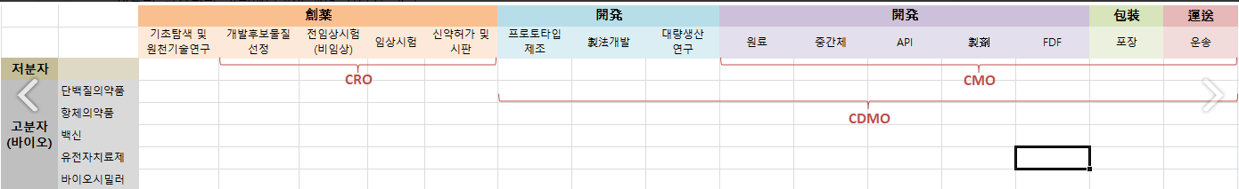 아래의 예는 제약섹션을 세로축: 제품별, 가로축: 밸류체인별로 나누어 제약업계에 해당하는 모든 시장을 분석해놓은 테이블이다.