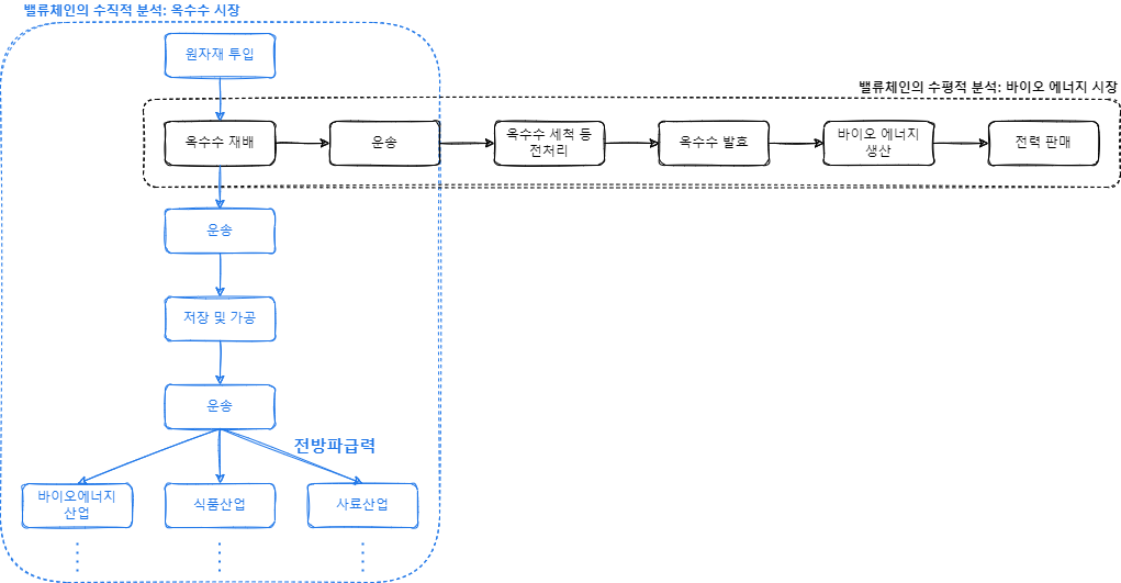 위의 옥수수 밸류체인 분석을 통해 수직적 밸류체인에 대한 감을 익힐 수 있다.