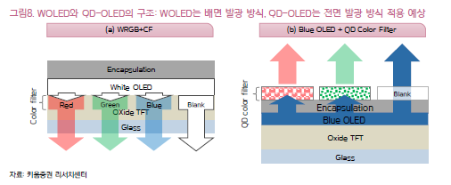 삼성디스플레이의 QD-OLED 패널은 LG디스플레이의 WOLED(White OLED) 패널과 “OLED 층 + 컬러필터” 라는 기본적 구조는 동일하나, LG는 R, G, B OLED를 Tandem 구조로 쌓아 올려 White OLED층을 형성했고, 컬러필터에는 LCD와 동일하게 R, G, B PR을 적용했다.한편, WOLED의 경우 빛이 TFT를 거쳐서 기판 방향으로 발광하는 “배면 발광(Bottom Emission)”이 적용되고 있다. 아래 그림과 같이 배면 발광의 경우 TFT를 거치는 부분은 빛이 통과되지 못하여 개구율(전체 면적에서 실제로 빛이 나오는 영역의 비율로, 개구율이 높으면 휘도가 높다)을 저하시킨다. “전면 발광(Top Emission)”의 경우 TFT를 등지고 투명한 cathode(음극)를 통해 빛이 빠져나가기 때문에 개구율을 증진시키고, 배면발광보다 낮은 전류를 걸어도 휘도가 더 좋다는 장점이 있다. 삼성은 중소형 OLED 양산을 통해 축적된 전면 발광 기술을 기반으로 QD-OLED에도 전면 발광 방식을 적용하여 개구율을 최대로 확보할 전망이다.