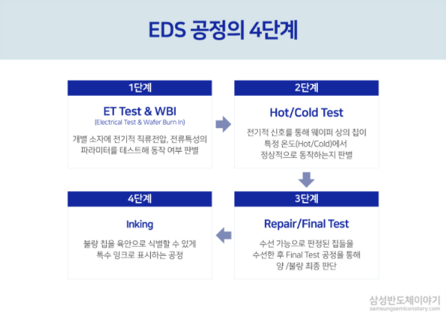 EDS공정은 세분화된 여러 단계가 있지만, 크게 4단계로 나눌 수 있습니다.
