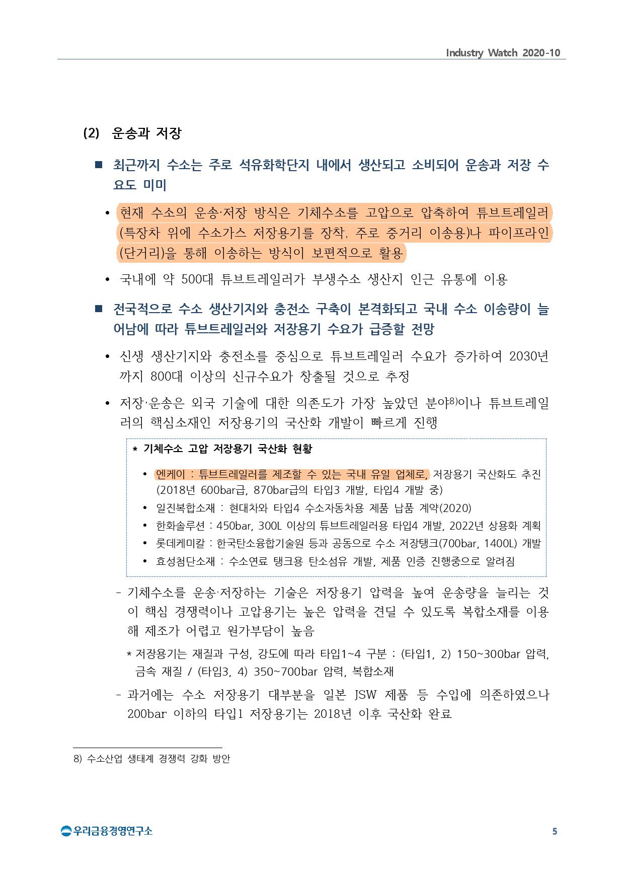 - 엔케이 : 튜브트레일러를 제조할 수 있는 국내 유일 업체로, 저장용기 국산화도 추진(2018년 600bar급, 870bar급의 타입3 개발, 타입4 개발 중)