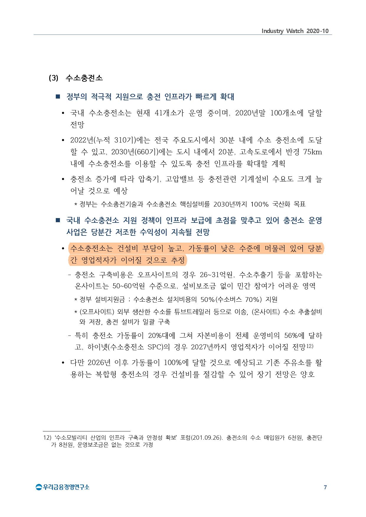 - 특히 충전소 가동률이 20%대에 그쳐 자본비용이 전체 운영비의 56%에 달하고, 하이넷(수소충전소 SPC)의 경우 2027년까지 영업적자가 이어질 전망12)