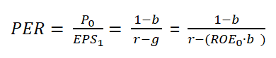 PER은 주가/EPS이므로, 주가의 부분에 위에서 도출했던 고든 성장 모형을 대입해주면 위와 같은 식이 됩니다.